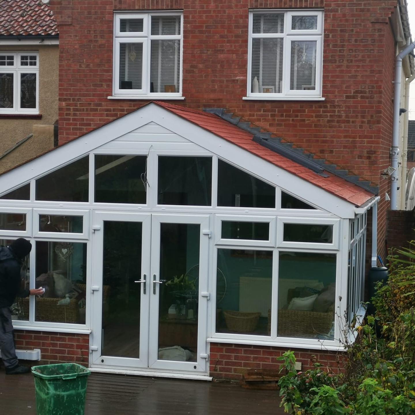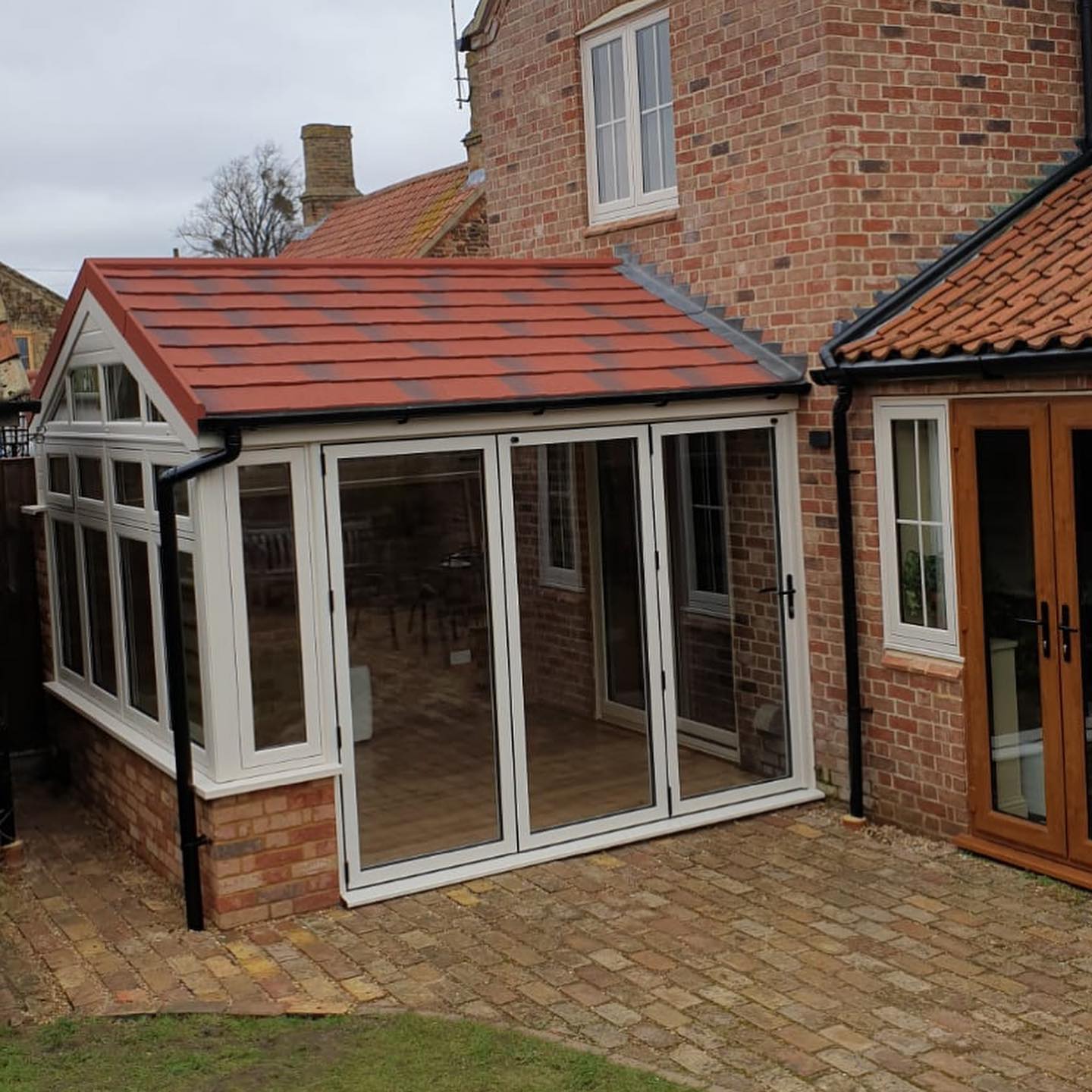 Gable Ended conservatory with Antique Red Shingle Tiles, this installation was further enhanced by a set of bifold doors leading on to the paved area.